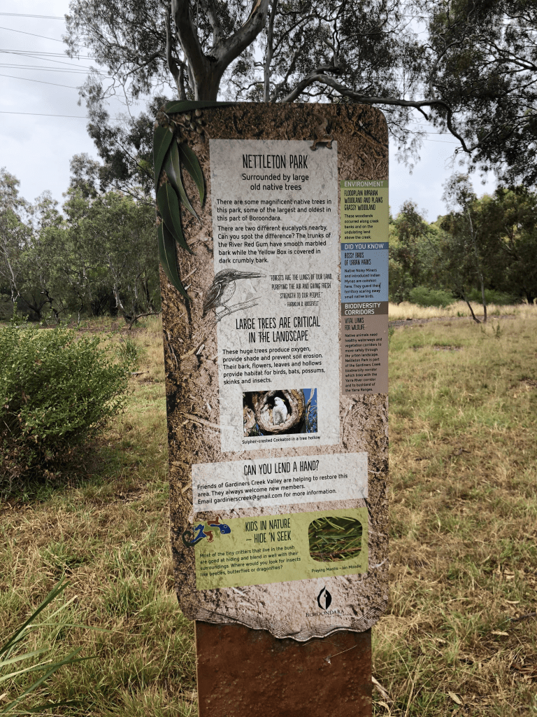 A Gardiners Creek Nature Trail is proposed to highlight natural features, distinctive trees and plants and the history of Gardiners Creek. The Gardiners Creek Nature Trail will be designed as a series of fractals with multiple start and end points adjacent to high pedestrian traffic locations along its length. The Gardiners Creek Nature Trail will incorporate exiting informal and formal walking paths and short lengths of new path to link existing paths into an interesting route. Seating and information boards will be provided at interesting viewing points. Preliminary design work has commenced for Stage 1 (Nettleton Park – Glenburn Bend Park). A Stage 1 project plan is being prepared by a Deakin University Environmental Science Student for publication in late June 2021. It is hoped that the Gardiners Creek Nature Trail will eventually run between Warrigal Road and the Yarra River with easy access from the adjacent railway stations.